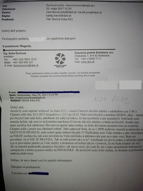 „Áno, nestál som. Áno, odmietol som prepravu. Nie, nebol plný autobus, avšak vozidlo bolo obsadené v prednej časti na viac ako 50 percent a teda z dôvodu bezpečnosti a ochrany zdravia iných cestujúcich som bicykel nevzal. Vo vozidle boli alkoholizovaní cestujúci, ktorí porozbíjali fľaše a porozlievali alkohol. Boli tam sklenené črepy, takže som cestujúcu s bicyklom nevzal aj z dôvodu ochrany jej majetku. Ak by som ju zobral, mohlo by dôjsť nielen k prípadnému úrazu, ale aj k poškodeniu bicykla (možný defekt)," uviedol vo svojom vyjadrení pre interné potreby DPB vodič nočného spoja N31. Ten zároveň odmieta vyjadrenie cestujúcej Andrey o tom, že by jej na konečnej zastávke vravel niečo o zákaze prepravy bicyklov v nočných linkách.