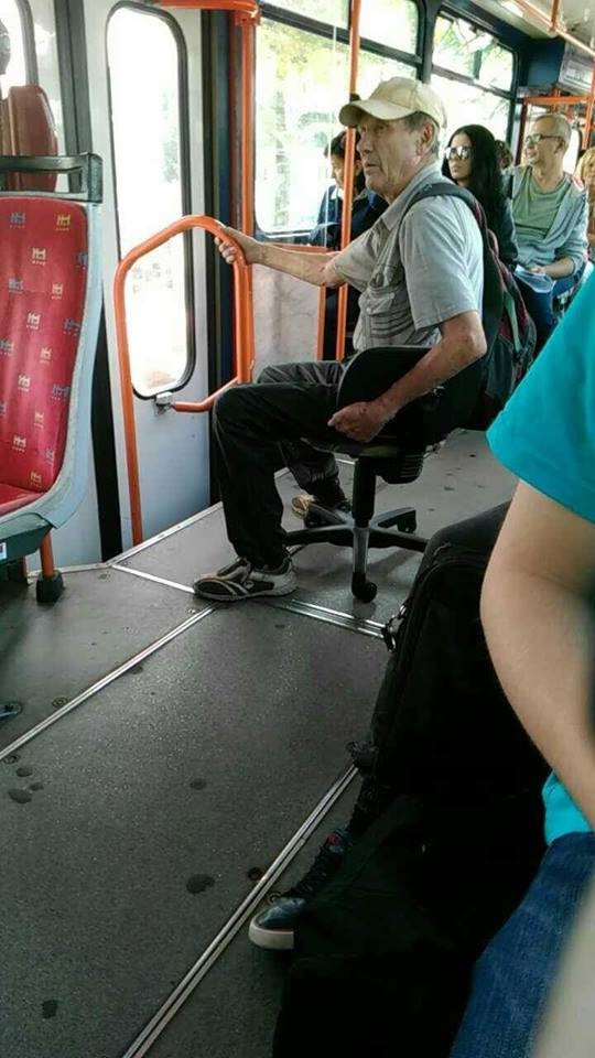 Tento muž si nemusí robiť starosti s tým, že by mu mladší cestujúci neuvoľnili miesto - má svoju stoličku stále so sebou.