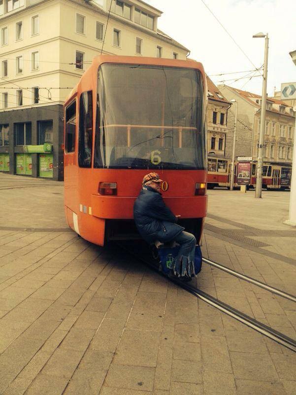Tohto pána asi revízori kontrolovať nebudú, ale nie je to práve najbezpečnejší spôsob cestovania...