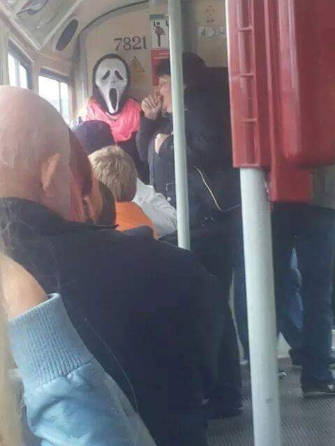 Cestujúci v maske z hororu Scream za bieleho dňa ostatných nevydesil, skôr vzbudzoval úsmev.