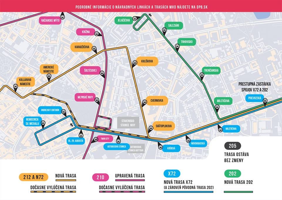 Bez zmeny trasy ostanú trolejbusy 205, keďže vozidlá na tejto linke disponujú pomocným dieselovým agregátom. DPB pripraví aj náhradnú autobusovú linku X72, ktorá bude premávať obojsmerne vo vylúčenom úseku Nemocnica sv. Michala, Mlynské nivy, Prievozská a Hraničná. Nočná trolejbusová linka N72 bude jazdiť obojsmerným odklonom cez ulice Záhradnícka a Svätoplukova. Viac informácií o zmenách v MHD môžu cestujúci nájsť na webovej stránke DPB.