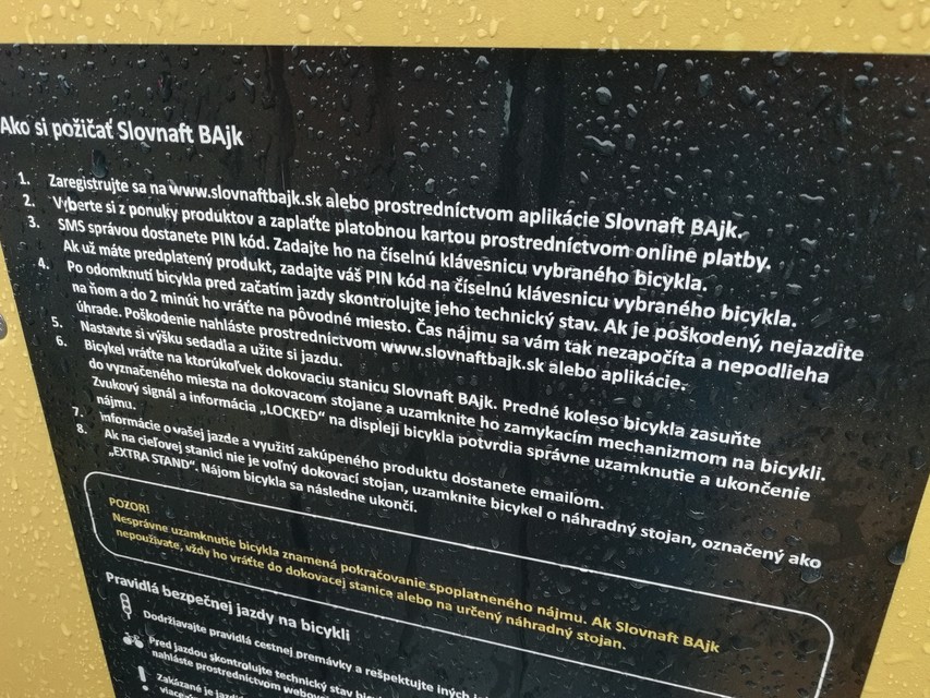 V nasledujúcich týždňoch začnú v uliciach Bratislavy pribúdať dokovacie stanice, niektoré ste si už asi aj všimli. Jedna (na fotografii) už stojí napríklad na Námestí SNP. Celkovo 10 smart staníc (digitálnych, kde sa dá platiť či registrovať) prostredníctvom ktorých si bude možné zapožičať bicykel a 80 klasických dokovacích staníc (napríklad i tá na Námestí SNP, bez elekriny, potrebná elektronika je totiž na bicykli) nainštalujú Slovnaft s hlavným mestom v štyroch najľudnatejších mestských častiach Bratislavy (Petržalka, Staré Mesto, Nové Mesto, Ružinov). Miesta staníc boli vyberané tak, aby bolo možné čo najjednoduchšie napojenie užívateľov na cyklotrasy a prestupy v rámci využívania bratislavskej mestskej hromadnej dopravy. Dokovacie stanice budú rozmiestnené vo vzdialenosti približne 300 až 500 metrov. Spočiatku však budú nefunkčné, a to až do spustenia krátkej, maximálne 48-hodinovej testovacej fázy s vybranými užívateľmi. Bezprostredne po nej bude pred letnými prázdninami, teda koncom 2. štvrťroka 2018, spustená pilotná fáza projektu pre verejnosť.