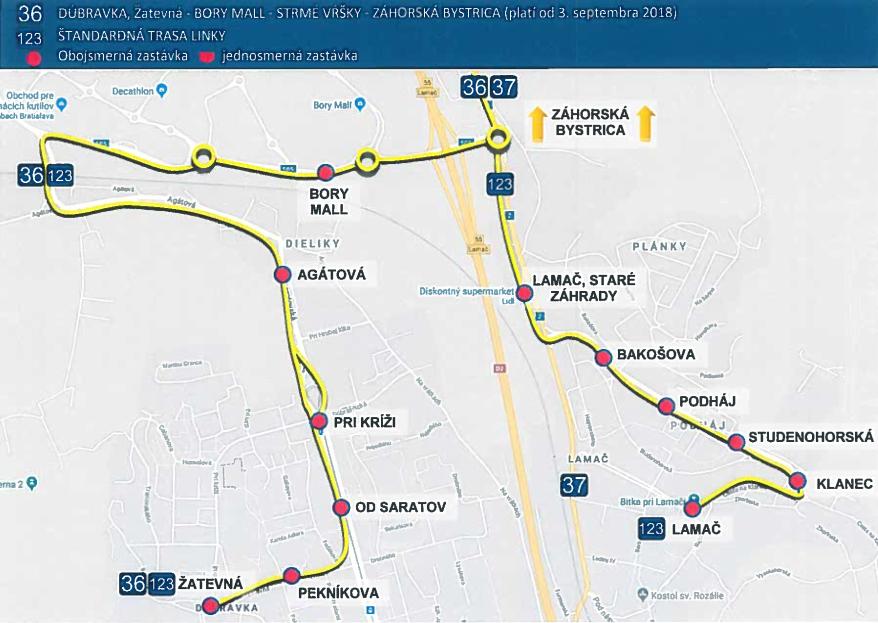 Doposiaľ prepravu smerom na Záhorie zabezpečovalo nákupno-zábavné centrum Bory Mall vlastnou “kyvadlovkou”. So zriadením novej linky kyvadlovú dopravu od 1. septembra po takmer štyroch rokoch ruší. Takto vyzerá mapa trasy novej linky č. 36: