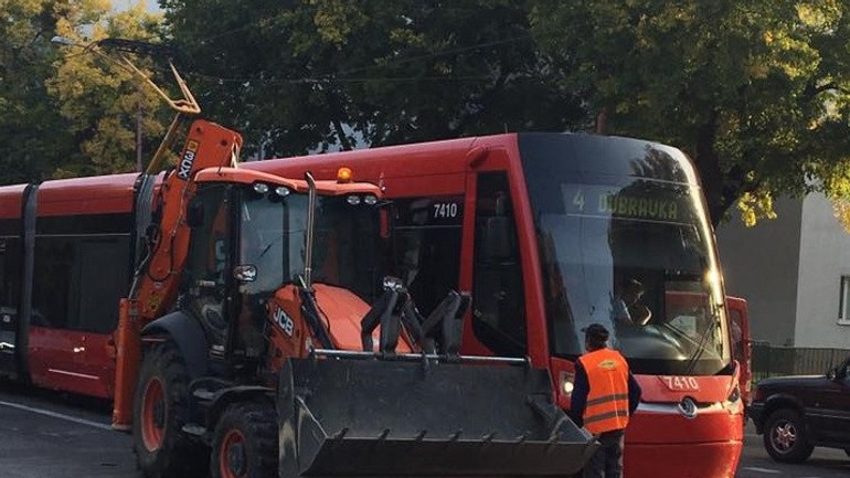 Na križovatke Vajnorskej a Kutuzovovej došlo dnes okolo deviatej hodine ku kolízii medzi električkou a bagrom, ktorý pravdepodobne pri prechádzaní cez električkovú trať vošiel do jazdnej dráhy električky. Tá mala po zrážke rozbitý celý predok a stála na mieste, pričom sa za ňou začali hromadiť električky a v oboch smeroch vytvárať kolóny motorových vozidiel.