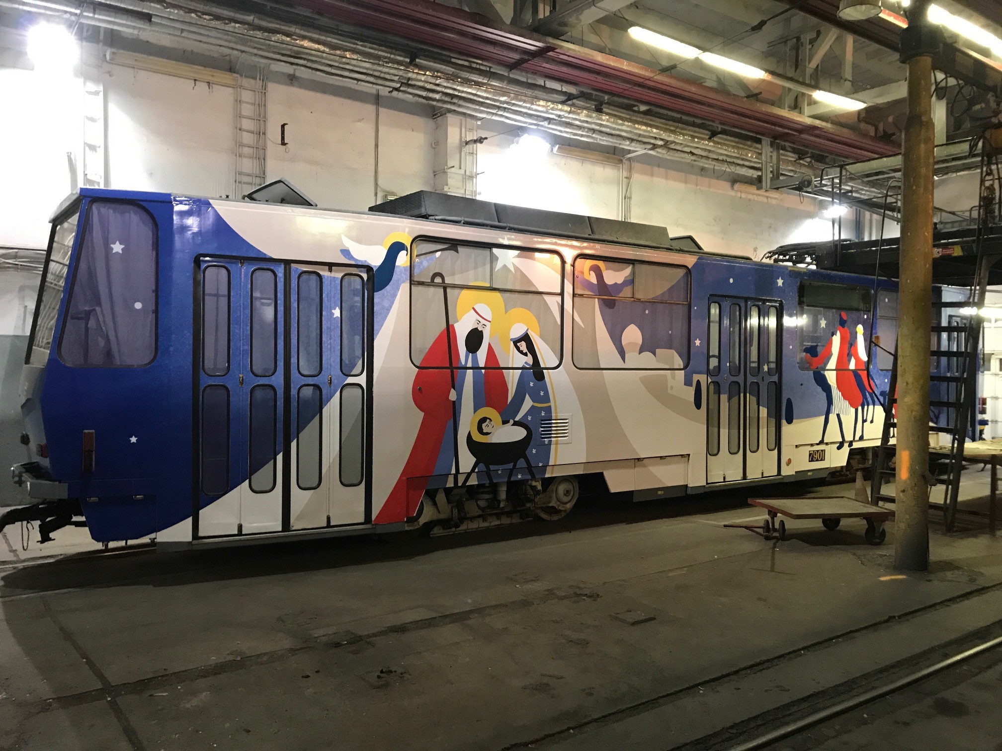 ,,Exteriér vozidla pripomína synonymum Vianoc - mesto Betlehem, kde sa narodil Ježiš Kristus. V zadnej časti interiéru vozidla sú jasličky s postavami svätej rodiny - Ježiša, Márie a Jozefa, troch mudrcov z Východu, ktorí sa prišli malému Ježiškovi pokloniť a priniesť mu dary s anjelmi, pastiermi a zvieratkami," informovala o tom hovorkyňa Dopravného podniku Bratislava (DPB) Adriana Volfová.
