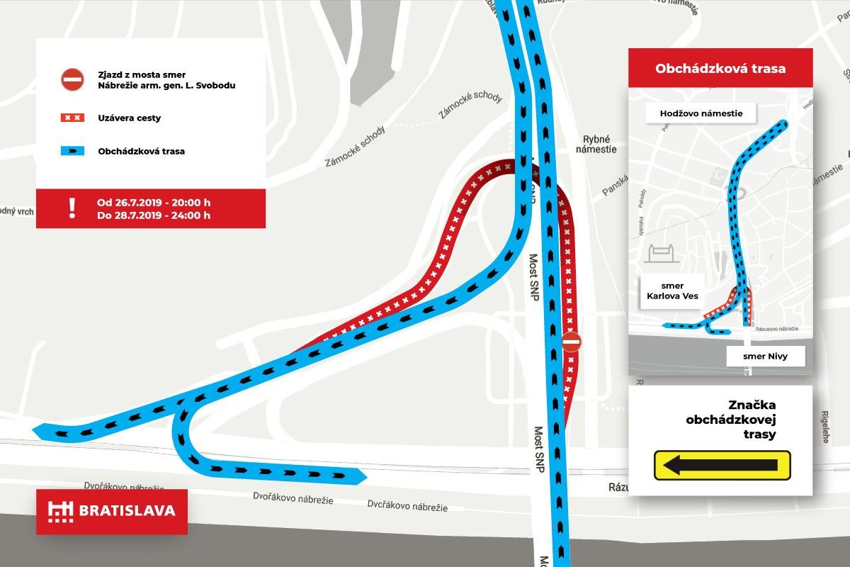 Tí, ktorí budú chcieť zísť z Mosta SNP na nábrežie v smere do Karlovej Vsi alebo k SNG budú počas tohto víkendu pokračovať v jazde na Hodžovo námestie, kde sa na obrátke vrátia na Staromestskú ulicu v smere na most a pravým odbočením na Nábrežie armádneho generála L. Svobodu.