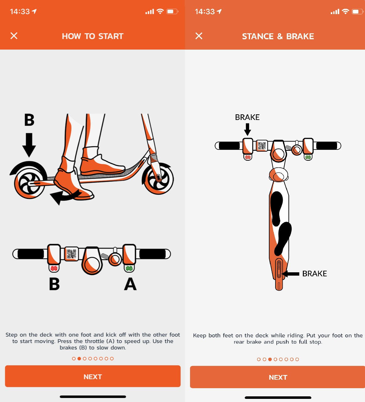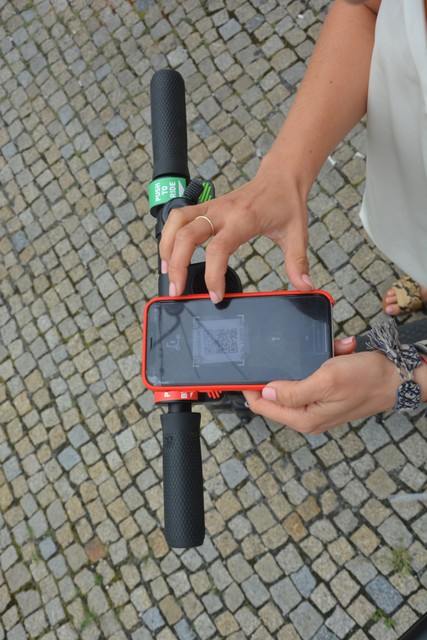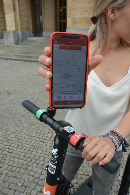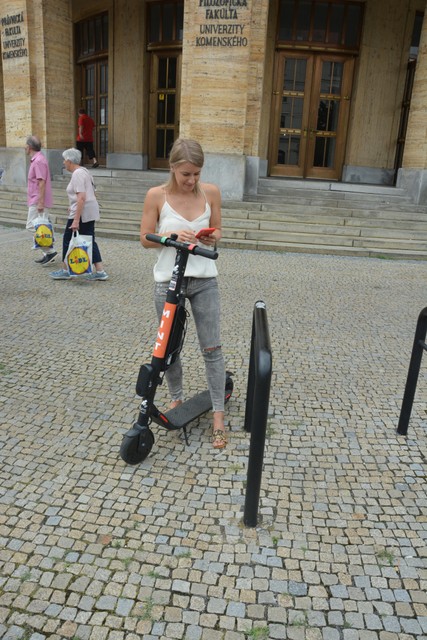 Stiahli sme si bezplatnú aplikáciu, ktorá je dostupná pre Google Play aj App Store. Nahrali sme do nej platobné údaje o našej karte. Následne nám aplikácia na mape ukázala polohu, kde sú aktuálne dostupné voľné kolobežky. Aplikácia nám ukazovala, že by mali byť pred Univerzitou Komenského hneď 2 kolobežky. Vybrali sme sa teda ku Šafárikovmu námestiu, a zobrali si odparkovanú kolobežku. Jednoducho sme nahrali QR kód, ktorý je na každej kolobežke, čím sme kolobežku odomkli. Následne nám pomocou grafických symbolov appka ukázala, ako na nej jazdiť – jazdí sa klasicky s dvoma nohami na plošinke a jazdu si sami regulujete pravým, kde pridávate rýchlosť, či ľavým tlačidlom (brzda). Pred jazdou vás teda upozorní na používanie prilby, dodržiavanie predpisov, jazdou pod vplyvom alkoholu či vhodných trasách, ktoré sú na jazdu vhodné. Nakoniec vás appka vyzve k odsúhlaseniu podmienok používania. V nich napríklad bolo uvedené, že používateľ prehlasuje, že je starší ako 18 rokov.