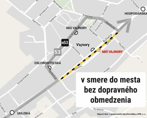 Premávka bude usmernená prenosným dopravným značením. Premávka MHD bude obmedzená minimálne, t.j. bude zriadená náhradná zastávka MiÚ Vajnory v smere do Vajnor, a to na Osloboditeľskej ulici.