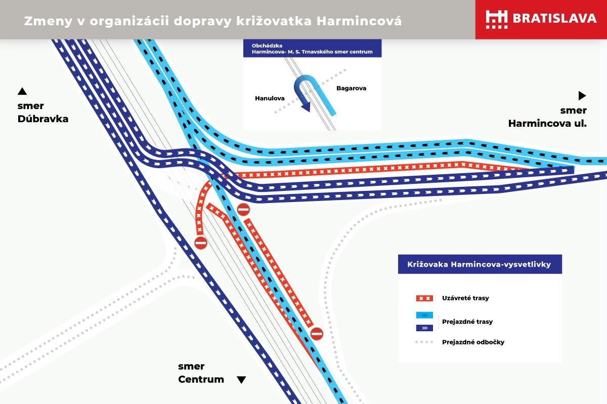 Ako vidno i na infografike, zrušené bude ľavé odbočenie z Harmincovej v smere do Karlovej Vsi a ľavé odbočenie z M. Schneidera-Trnavského v smere z Karlovej Vsi. Otočiť sa budete môcť na prejazde pri Hanulovej. Prejazd križovatkou po M. Schneidera-Trnavského v smere z Karlovej Vsi do Dúbravky bude iba v jednom jazdnom pruhu.