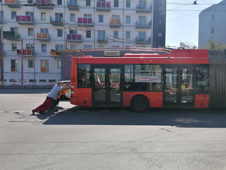 Neobyvyklý pohľad sa včera naskytol vodičom i chodcom v bratislavskom Ružinove. Kĺbový trolejbus linky číslo 212 tlačila pätica chlapov. Zisťovali sme, čo sa presne stalo.