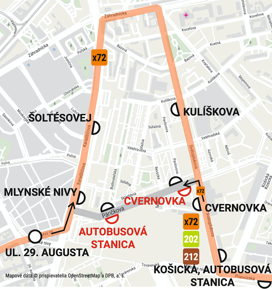 Pre haváriu na vodovodnom potrubí v križovatke Páričkova - Svätoplukova Dopravný podnik Bratislava presmeroval autobus X72 na náhradnú trasu.