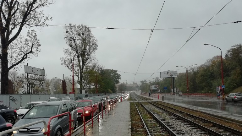 Autá taktiež takmer stoja na nábreží v smere z Karlovej Vsi do centra mesta (na fotografii).