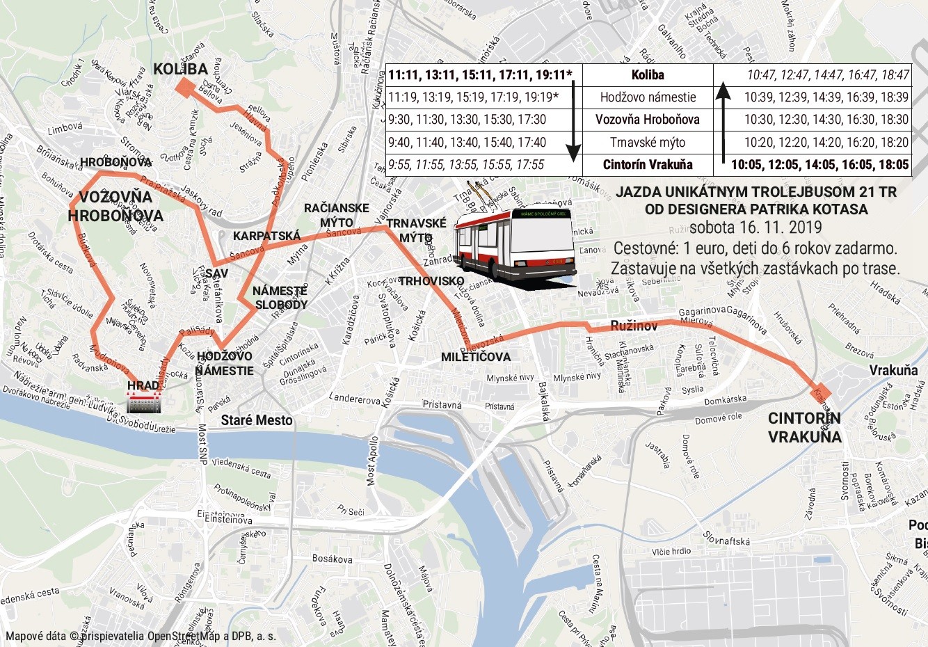 Trolejbus 21 Tr bude premávať v sobotu 16. 11. na špeciálnej linke “Máme spoločný cieľ”, ktorá bude viesť cez celé mesto od Cintorína Vrakuňa - Mierová - Saleziáni - Trnavské mýto - SAV - Hroboňova - Bratislavský hrad - Hodžovo námestie - Koliba. Zastavuje na všetkých zastávkach po trase.