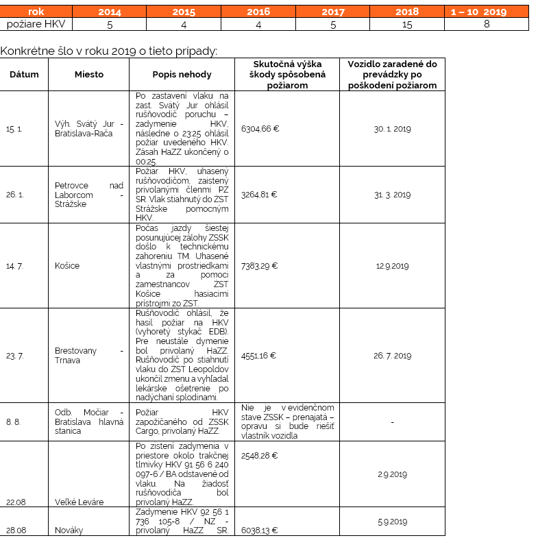 "Na to, že horia staré rušne, som si už pomaly zvykol, ale tentokrát dym vychádzal z relatívne novej vlakovej súpravy, čo ma prekvapilo," komentoval video zverejnené na FB stránke Zomri jeden z užívateľov. spoločnosť ZSSK reagovala: "Áno, je to relatívne nový vozeň, nie, nie je to bežná porucha. Vyšetrujeme to. Nebudeme veľmi ukazovať na iných, ale kto chce, vie, že z času na čas sa aj nové auto či vlak pokazia... Takto to u nás vyzeralo do konca októbra (evidujeme len tie prípady, kde je škoda nad 2600 euro) a pripojili nasledujúcu tabuľku: