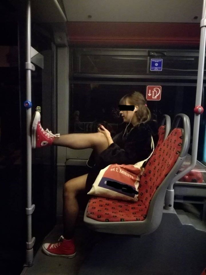 Aj táto slečna si možno myslí, že si vyložením nohy na tyč urobila počas cestovania maximálne pohodlie, ale rozťahovať takto nohy na verejnosti je dosť nemravné a to aj v prípade, že by nemala oblečenú sukňu. Podľa autorky tejto fotografie na jej upozornenie reagovala dievčina akurát tak, že si zvýšila hlasitosť v slúchadlách...