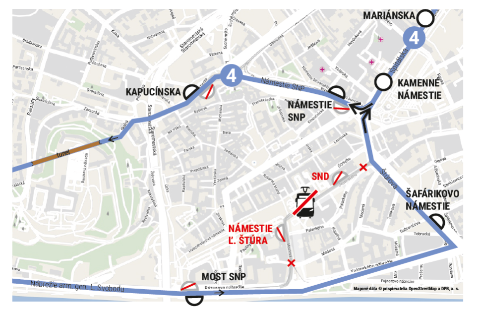 "Na Hviezdoslavovom námestí budú vo štvrtok doobeda prebiehať prípravy na Vianočné trhy a osádzanie betónovych zábran. V čase približne od 9:00 do 12:00 budeme musieť presmerovať električky na náhradnú trasu. Linka 4 bude krátkodobo premávať cez centrum mesta opačným okruhom. V smere do centra mesta zabočí od zastávky Kamenné nám. priamo na prestupný uzol Námestie SNP. Cez Kapucínsku bude pokračovať do tunela, k Mostu SNP a cez Šafárikovo nám. sa vráti späť na Kamenné nám., kde sa napojí na svoju trasu ďalej smer ŽST Nové Mesto, resp. Zlaté Piesky. Upozorňujeme, že zastávky SND a Nám. Ľ. Štúra nebudú električkami obsluhované," informoval nás Martin Žarnovický, manažér PR a marketingu DPB.