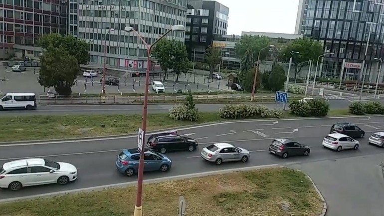 Netradičný automobilový prvomájový sprievod stoviek áut rozdelila svetelná signalizácia na niekoľko menších kolón, pričom sme si všimli, že situáciu monitorovali aj za pomoci kamery príslušníci motorizovanej jednotky Policajného zboru SR.