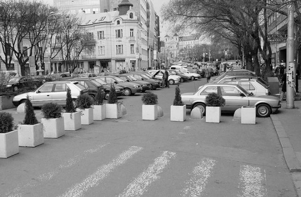 Námestie SNP pripomína skôr parkovisko ako centrálne bratislavské námestie. Motoristi parkujú po celej dĺžke námestia, najhoršia je však situácia v jeho spodnej časti. Pred Ľudovou bankou a kaviarňou Vienna sa však nedávno objavili známe žulové zábrany, ktoré tu tak vytvorili ostrovček bez áut. Škoda, že predstavitelia magistrátu tieto zábrany nedali osadiť hneď pri vjazde do tohto priestoru. Zostáva veriť, že po otvorení neďalekých podzemných garáží na Františkánskej ulici mesto konečne toto „parkovisko" zlikviduje a Námestie SNP sa vráti chodcom.