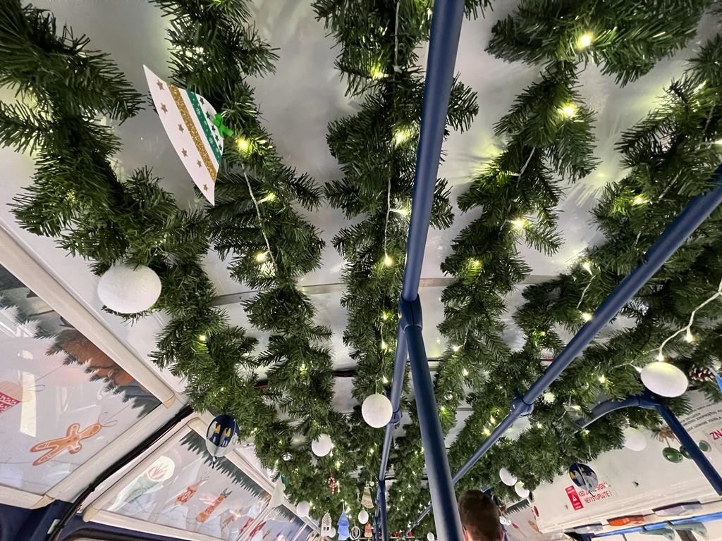 Ručne vyrobené ozdoby vnútri električky vyrobili žiaci zo Spojenej školy na Mokrohájskej ulici 3.