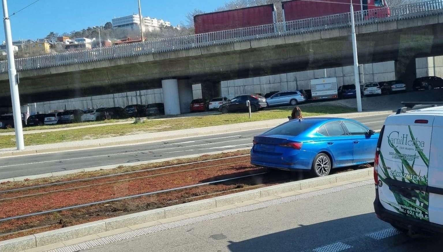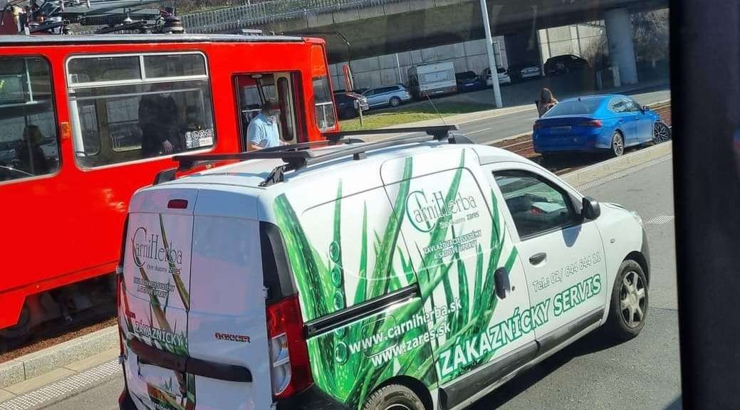 Kuriózna situácia. Električky smerujúce do centra mesta zablokovalo osobné auto, ktoré sa nevedno ako ocitlo v koľajisku.