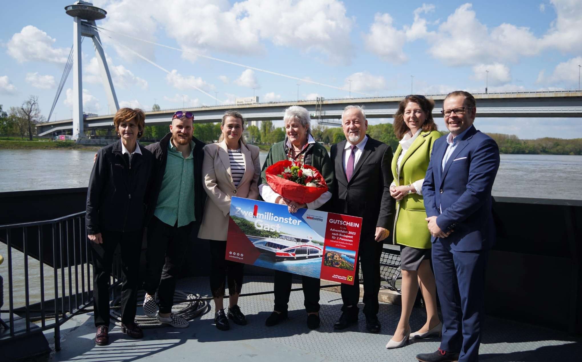 Privítanie lode s dvojmilióntym pasažierom sa uskutočnilo 26. apríla. Okrem zástupcov spoločnosti Twin city Liner, predsedníčky komisie pre cestovný ruch a medzinárodnú spoluprácu Mestského zastupiteľstva Bratislavy Jany Jakubkovič a Vladimíra Greža, privítala všetkých cestujúcich aj kapela Funny Fellows. Každý pasažier tejto linky dostal na privítanie aj bratislavský rožok.