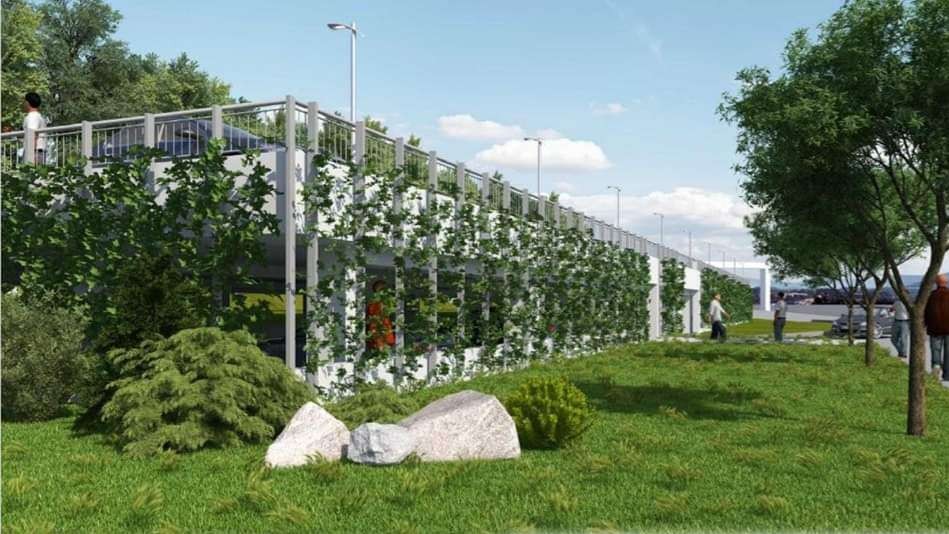 Parkovací dom bude čiastočne zapustený do terénu. Druhé nadzemné podlažie je oproti prvému rozšírené o vysunutý chodník s pešími lávkami prepojenými priamo na Železničnú ulicu. Vjazd pre osobné automobily na prvé podlažie bude riešený rampou cez vstupný portál a peší výstup samostatne. Peší výstup bude riešený vrátane rampy pre imobilných. Priamy prechod bude znemožnený poplastovanými plotovými panelmi v kombinácii s lankovým systémom pre vytvorenie zelenej steny s prerastením popínavou zeleňou.