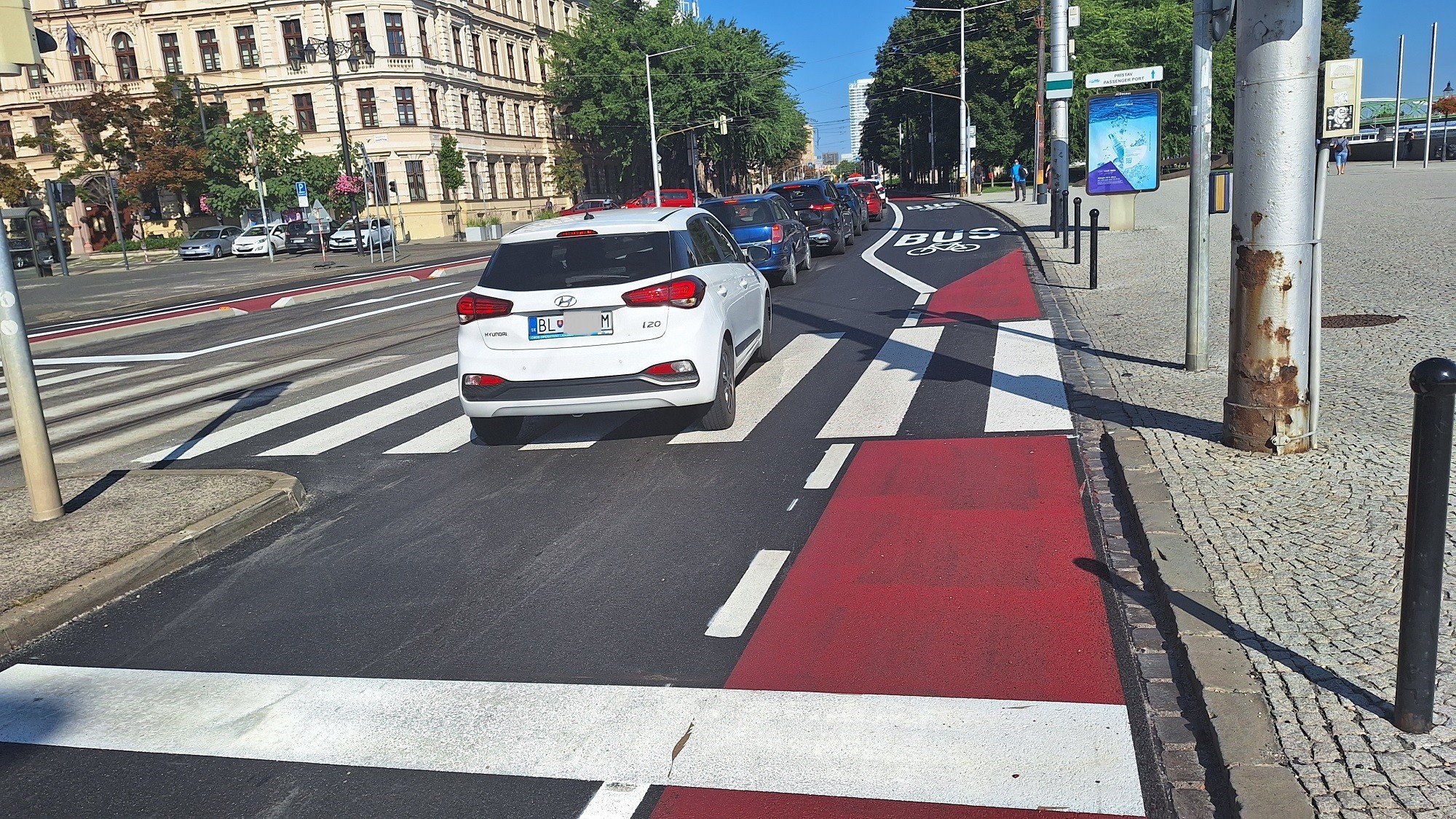 Z opačnej strany, od Šafárikovho námestia, sme si zase uvedomili, že podaktorí cyklisti zabúdajú, že sa nachádzajú na cestnej komunikácii, a teda musia sledovať napríklad aj to, či im na semafore svieti zelená, alebo nie. Pri Námestí Ľudovíta Štúra rozbehnutý mladík na bicykli zabrzdil pred priechodom pre chodcov v poslednej chvíli. Myslite tu aj na to, že niektoré vozidlá v protismere pôjdu cez váš cyklopruh na Mostovú, aby sa dostali napríklad do podzemnej garáže pri Hviezdoslavovom námestí, takže ignorovať červenú na semafore sa môže vypomstiť. My sme mali zážitok ešte o kúsok ďalej, pri hoteli Devín, keď súbežne idúce auto nečakane odbočilo doprava tak, že nám skrížilo cestu. Aj s takouto chybou vodiča je dobré rátať, na kolíziu totiž zvyčajne doplatí ten zraniteľnejší...