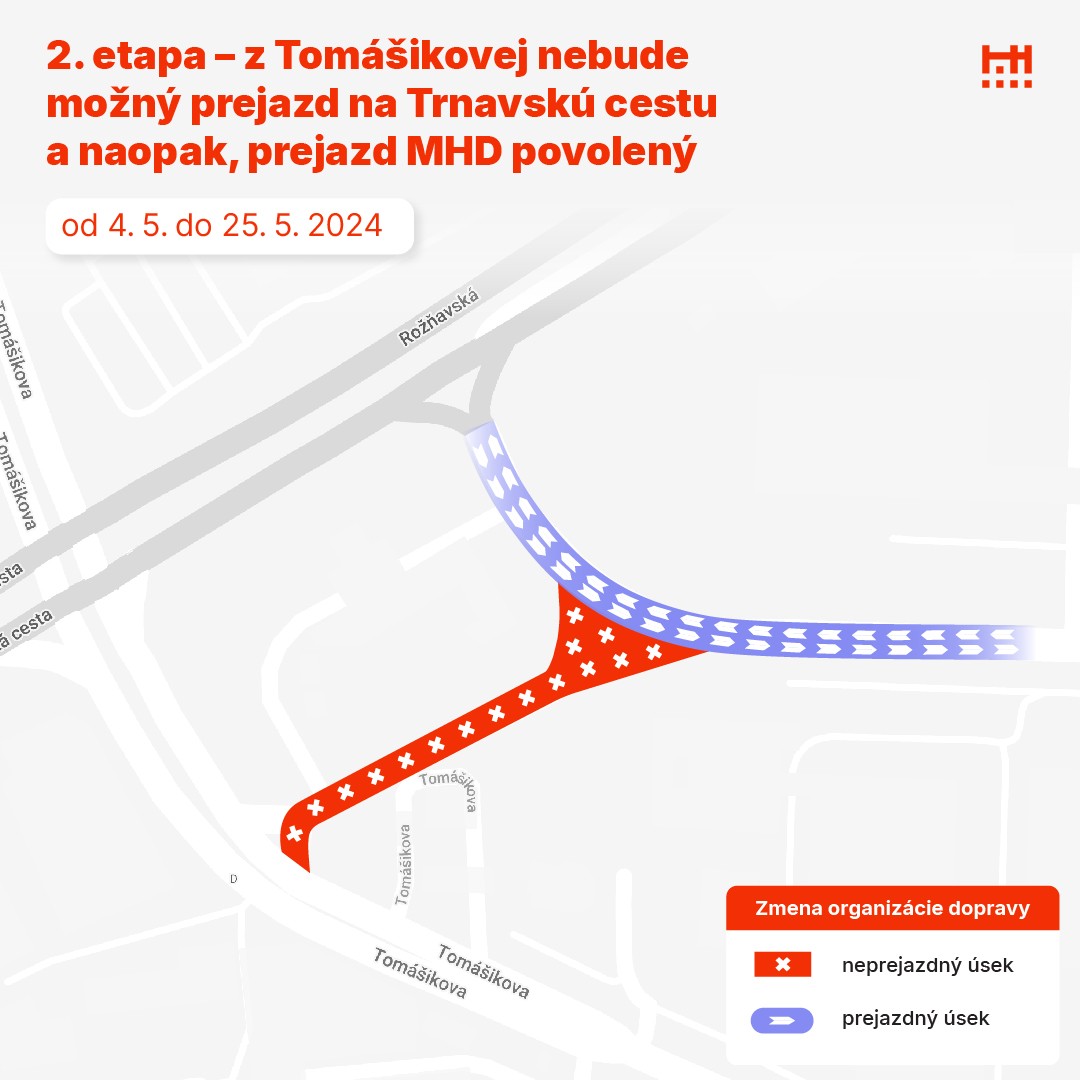Druhá etapa bude prebiehať od 4.5. do 25.5.2024. Časť križovatky bude uzavretá, z Tomášikovej nebude možný prejazd na Trnavskú cestu a opačne, pre MHD bude križovatka prejazdná.