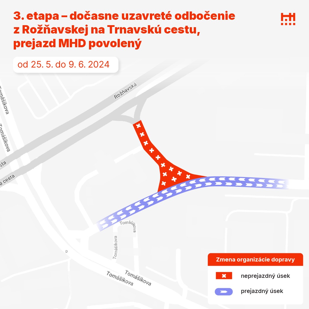 Tretia etapa bude prebiehať od 25.5. do 9.6.2024. Dočasne bude zrušené odbočenie z Rožňavskej na Trnavskú cestu, prejazd MHD bude umožnený.