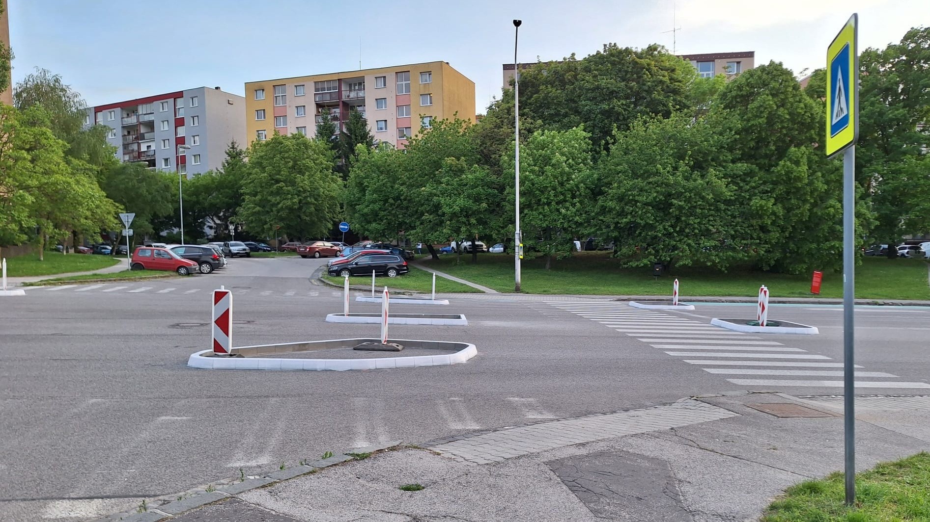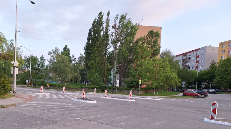 Tak sa ako súčasť riešenia realizuje aj križovatka s jedenástimi ostrovčekmi z lepených obrubníkov, ktoré sú tvorené tak, aby sa dali v budúcnosti relatívne ľahko upravovať. Zúžením priestoru má dochádzať k spomaleniu áut na mieste, kde doteraz takmer 60 percent vodičov prekračovalo povolenú rýchlosť.