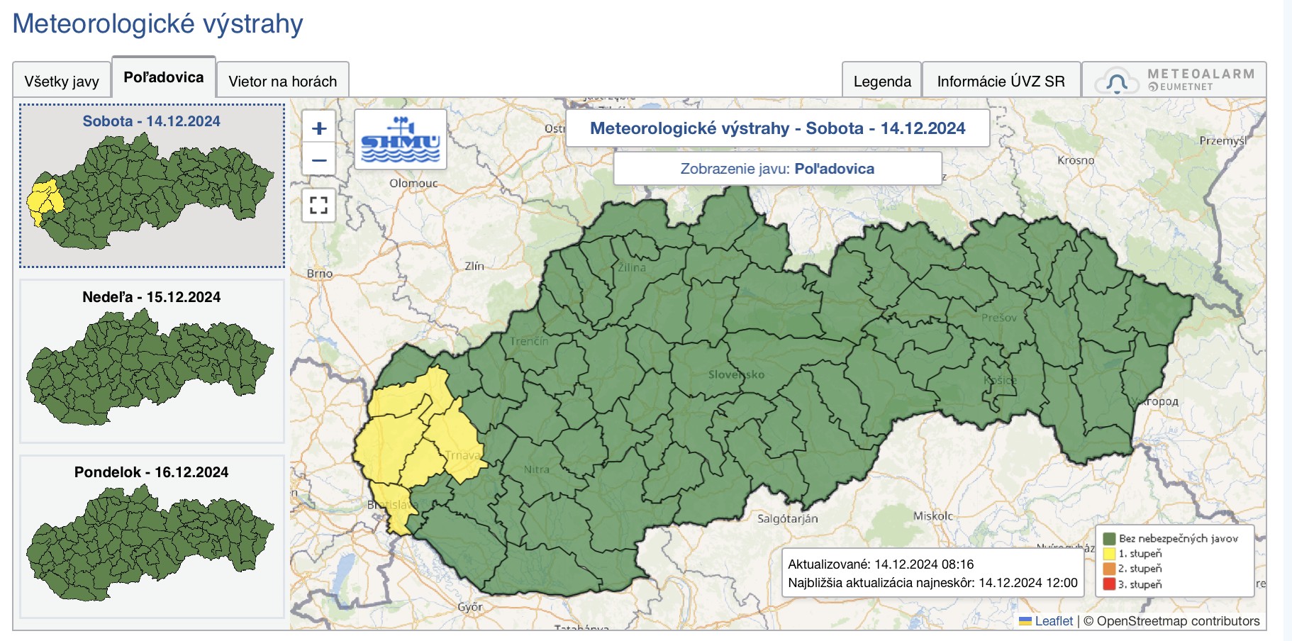 Slovenský hydrometeorologický ústav (SHMÚ) vydal výstrahu pre okresy Bratislava, Malacky, Pezinok, Trnava a Senica. Výstraha platí do sobotňajšieho poludnia, meteorológovia spresnili, že poľadovica sa môže tvoriť vo vyšších polohách.