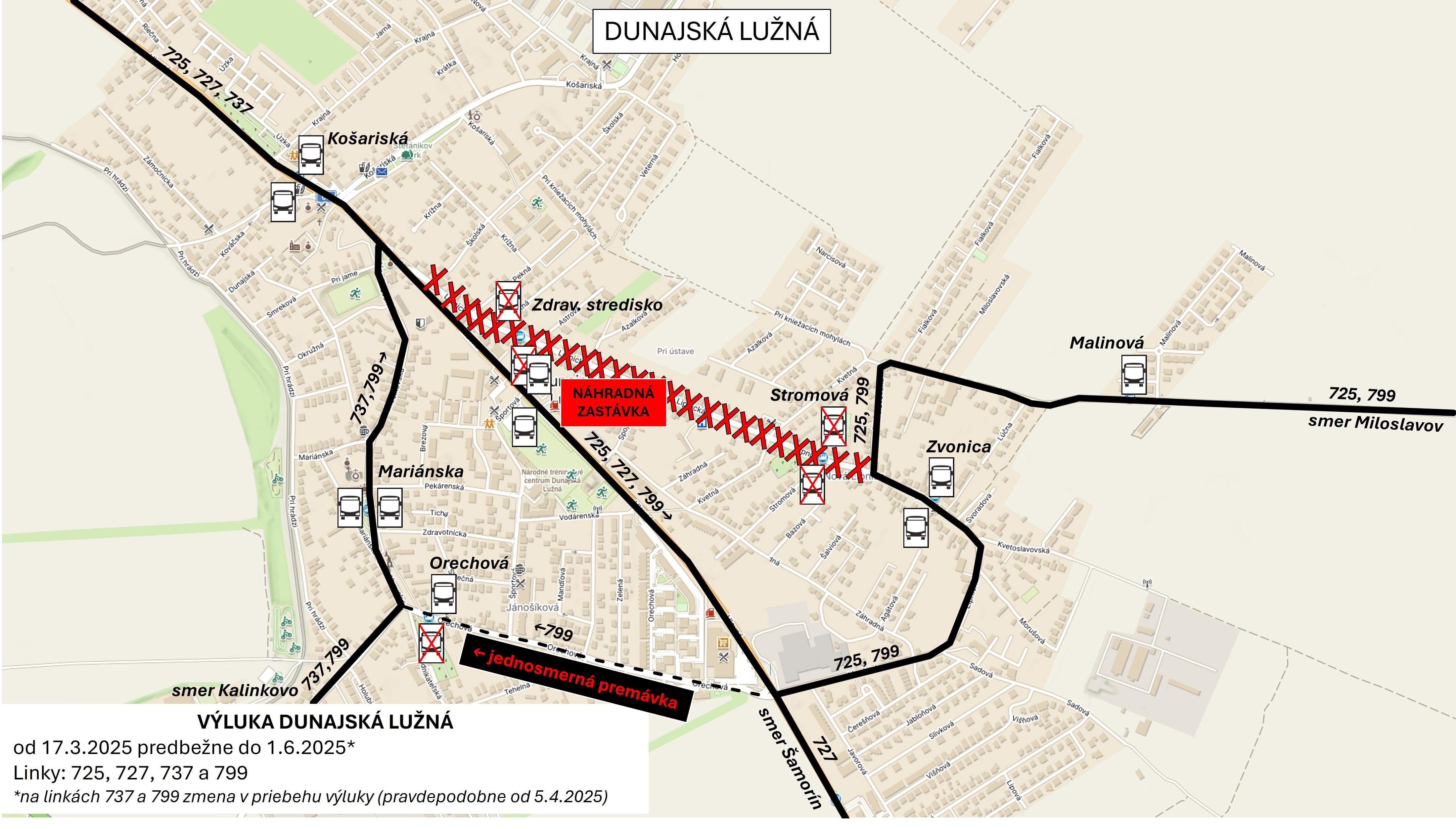 Linka 725 (Bratislava – Miloslavov) pôjde medzi zastávkami Dunajská Lužná, Košariská a Dunajská Lužná, Malinová odklonom. Po obslúžení zastávky Košariská rovno po Hlavnej, následne doľava na Lipnickú a po odbočení doprava na Miloslavovskú sa napojí na svoju štandardnú trasu. Uvedené platí obojsmerne. Na obchádzkovej trase obslúži obojsmerne zastávku Zvonica na Lipnickej a Zdravotné stredisko v náhradnej polohe na Hlavnej. Zastávku Stromová nebude obsluhovať.