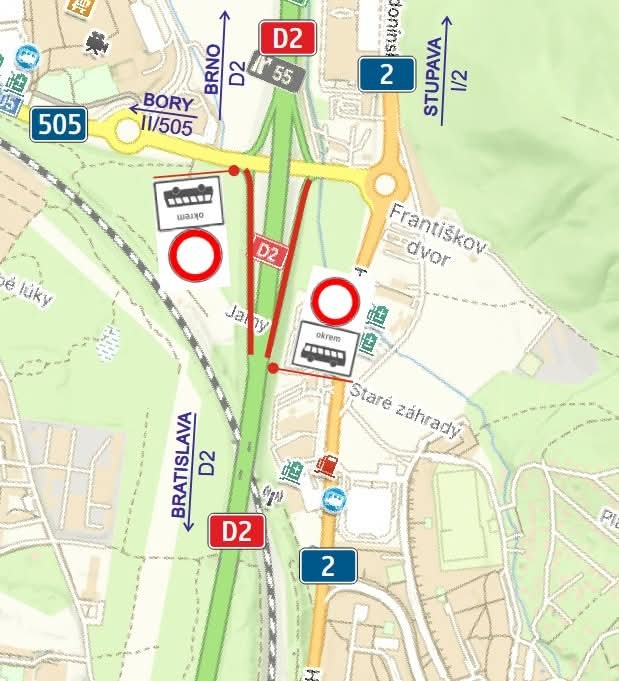 Pre zaistenie bezpečnosti pracovníkov aj motoristov je podľa diaľničiarov nevyhnutné na niekoľko mesiacov obmedziť dopravu. Pre osobné vozidlá sa v smere na Českú republiku uzavrie zjazd z D2 na cestu II/505, na opačnej strane výjazd z II/505 na D2 v smere do Bratislavy. Zákaz sa nebude týkať vozidiel mestskej hromadnej dopravy a záchranných zložiek. Zmena režimu je plánovaná od soboty, aby obmedzenie prebiehalo dominantne počas letných prázdnin. Alternatívne trasy budú cez Lamač, Dúbravku alebo križovatku Stupava.