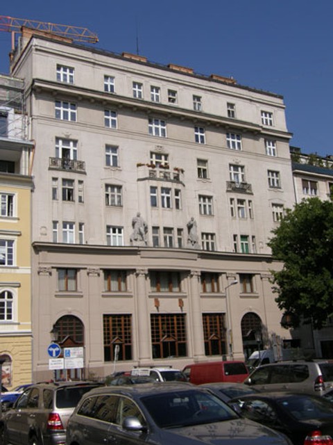 Bývala tam mestská priekopa, a za ňou parkánový múr opevnenia. Objekt stavali dva roky. Počas stavby sa ukázalo, že Polívkom navrhovaná fasáda by pôsobila nemoderne, lebo obsahovala secesné prvky, v 20. rokoch už nevhodné. Stavbu viedol namiesto projektanta architekt Evžen Linhard. Pravdepodobne to bola jeho zásluha, že namiesto secesných ozdôb sa uplatnila ornamentika, pripomínajúca zľudovelé barokové motívy.