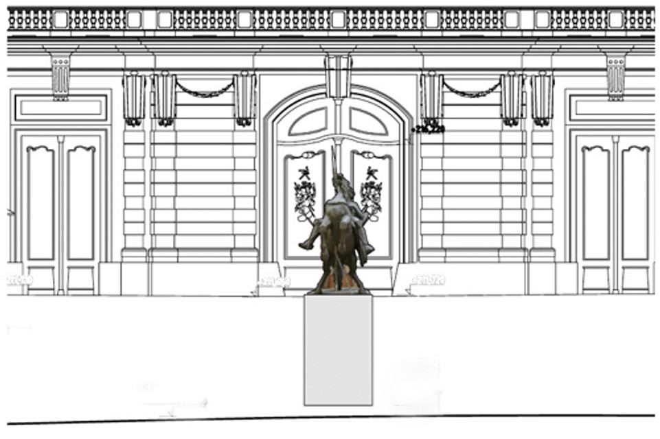 V strede čestného nádvoria je dlažba prerušená otvorom zakrytým doskami. Má tam stáť pomník. Aby sa návštevníci vychádzajúci z paláca, najmä budúci štátnici z cudziny, mohli pozrieť na príťažlivý tučný okrúhly konský zadok. Zadok legendárneho koňa ešte legendárnejšieho Svätopluka od slovenského sochára. Legendy totiž z jednoznačne zápornej postavy stredoeurópskych dejín urobili romantického hrdinu “mierumilovných” Slovanov. Najmä legendy marxistickými historikmi a ich pokračovateľmi prostredníctvom literárnych diel pochybnej kvality povýšené na úroveň “vedeckej pravdy”. Akoby sa skutočne každý donekonečna opakovaný nezmysel musel stať pravdou.