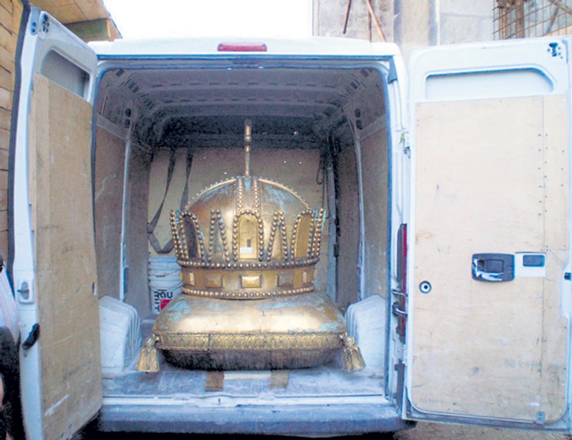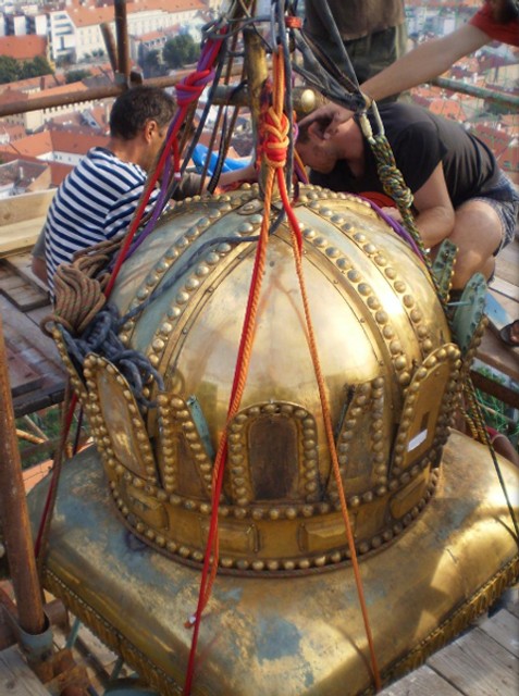 Posledný raz bola dolu v roku 1905. Počas rekonštrukcie chrámu v 60. rokoch mali pracovníci reštaurátorskej firmy možnosť dostať sa až ku korune, pre verejnosť to však bola nesplniteľná túžba. A možno práve preto vznikli legendy o obrovskej veľkosti koruny.
