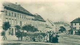 Záber je neuveriteľný. Po sto rokoch od realizovania pôvodnej fotografie možno už na historickej snímke identifikovať iba jediný dom. Je to objekt vpravo – nájomný dom pri kláštore Milosrdných bratov (Nám. SNP 11). Dom podľa projektu viedenského architekta profesora W. Ostertaga postavil v roku 1836 tunajší stavebný podnikateľ Ignaz Feigler.