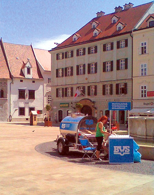 Tohoročné leto je u nás skutočne mimoriadne teplé, ľudí trápi smäd. Dalo by sa predpokladať, že sa smädní občerstvia pri takzvanej „pitnej fontánke“, ktorú v rámci nie práve najšťastnejšej úpravy Hlavného námestia dala postaviť Bratislavská vodárenská spoločnosť. Mala to byť akási pietna pripomienka zaniknutej vojenskej strážnice. Bronzová postava vojaka (bohvie v akej uniforme, rozhodne nie v uniforme niekdajšej mestskej stráže) v kamennom prístrešku je však skôr ťažko pochopiteľnou karikatúrou. Turisti búdku často považujú za pisoár. Aké je však prekvapenie, keď potenciálny používateľ zistí, že na zadnej strane nie je ani žľab, ani misa, ale nefungujúca fontánka? Pri veľkolepej, zbytočne drahej a zásadám pamiatkovej starostlivosti odporujúcej úprave námestia po roku 2003 totiž nikto z iniciátorov nemyslel na potrebu verejných záchodov. Ale zato na znehodnotenie historickej fontány drahým a nepotrebným betónovým rozšírením či „obohatením“ (v ktorom sú ukryté aj nikdy nepožité reproduktory na hudobné potešenie okoloidúcich) a na zriadenie „pitnej fontánky“, ktorá je roky „suchá“, áno. Bratislavská vodárenská spoločnosť namiesto toho, aby uviedla „svoju“ fontánku do prevádzky (možno stačí otočiť niekde umne utajeným kohútikom), dotiahla 25. júla 2013 k Maximiliánovej fontáne pojazdnú cisternu a mladé slečny ponúkali okoloidúcich čerstvou vodou.