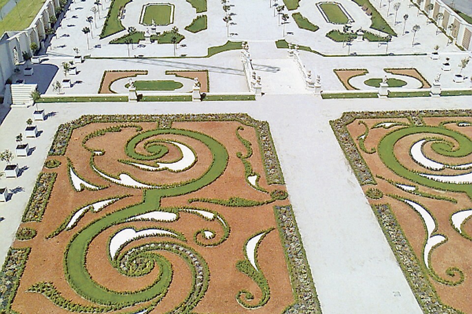 Terén pred pavilónom upravili do štyroch plochých vodorovných stupňov – terás. Na nich boli ornamentálne do kobercových vzorov vysadé okrasné rastliny. Na najvyššej terase len veľmi nízke kvety a kríčky, na nižšej vyššie kríky, na dolnej aj vysoké strihané kríky a vyššie stromy. Nikdy tam neboli stromy staršie ako 20 rokov. V prenosných drevených nádobách stáli pomarančovníky a citrónovníky, ktoré sa na zimu prenášali do vykurovaného skleníka (oranžérie) na dolnej východnej terase. Južná stena oranžérie bola celá nahradená sklenenými oknami. V záhradách možno rástli aj figovníky a iné cudzokrajné rastliny. Obvodové steny záhrady boli a budú pokryté popínavým viničom. Po presťahovaní kráľovskej rezidencie do Budína sa o okrasné záhrady nemal kto starať. Možno v nich dočasne pestovali zeleninu. Definitívne ich zničilo vojsko.