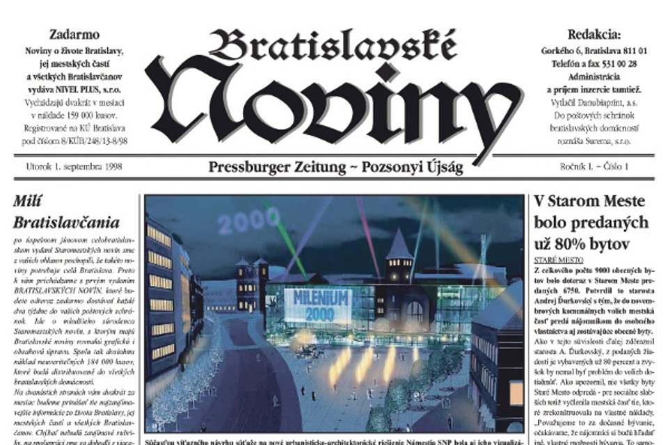 Bratislavské noviny, ktoré vyšli 1. septembra 1998, neriešili problémy, ktoré boli až také vzdialené od súčasných. Písalo sa v nich napríklad o niektorých vydarených rekonštrukciách, ale aj o takých, ktoré sa nikdy neuskutočnili, o problémoch s autami v pešej zóne či o čistote ulíc. Bratislavčania sa v tom čase potešili, že obľúbená Vegetka na Laurinskej ulici zostane, ako automatické brali, že v najvyššej futbalovej lige hrali Slovan, Inter aj Petržalka, či fakt, že hokejový Slovan ide obhajovať titul...