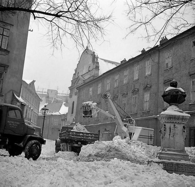 Na archívnej snímke z 8. februára 1963 stroje v uliciach Bratislavy odpratávali sneh. Pracovníci Technických služieb mesta Bratislava mali vtedy v uliciach mesta 10 strojov na odpratávanie snehu a 55 nákladných áut.