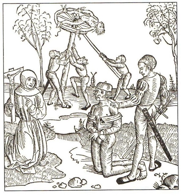 2. Poprava mečom a lámaním kolesom - obrázok z tzv. Bamberského trestného poriadku (Bambergische Peinliche Halsgerichtsordnung - Constitutio Criminalis Bambergensis) z roku 1507: