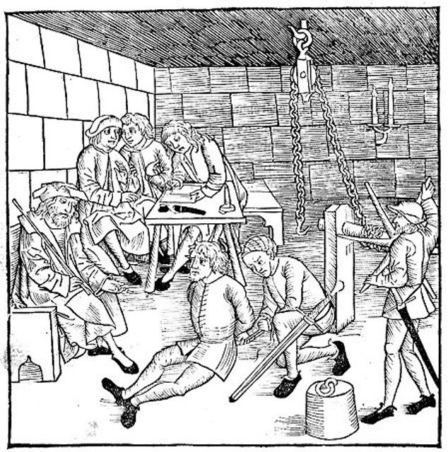 3. Mučenie podozrivého za účasti richtára, dvoch prísažných, pisára a kata s pomocníkom - taktiež Bamberský trestný poriadok z roku 1507