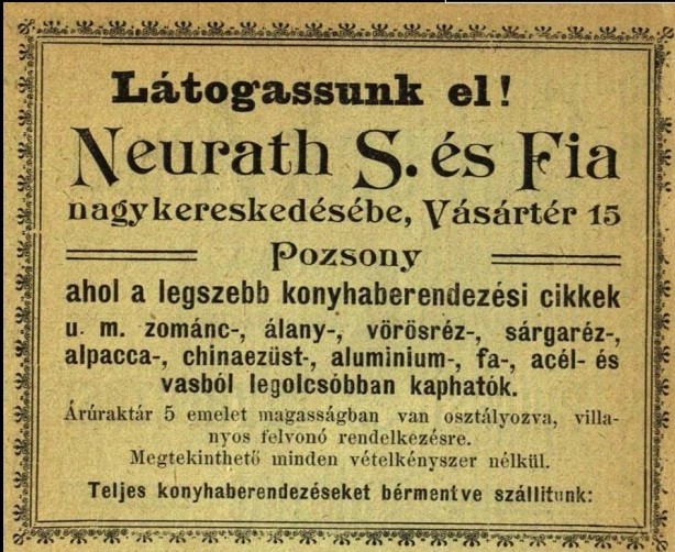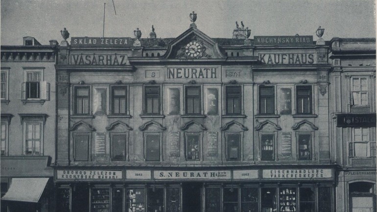Firma Neurath a syn - obchodný dom so železiarstvom a tovarom pre zámočníkov, stolárov, kolárov či obuvníkov bola založená v roku 1863. Budova, v ktorej sa nachádzali sklady, obchody, kancelárie a byty bola situovaná na dnešnom Kamennom námestí. Respektíve v spodnej časti súčasného Námestia SNP, ktoré sa pred druhou svetovou vojnou volalo Námestie republiky. Po jej skončení však bol tento z architektonického aj vizuálneho hľadiska nepochybne krásny objekt zbúraný...