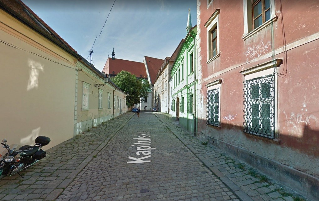 Na tomto zábere vidno vežu Dómu svätého Martina, akurát namiesto vozíka sa na Kapitulskej nachádza motorka.