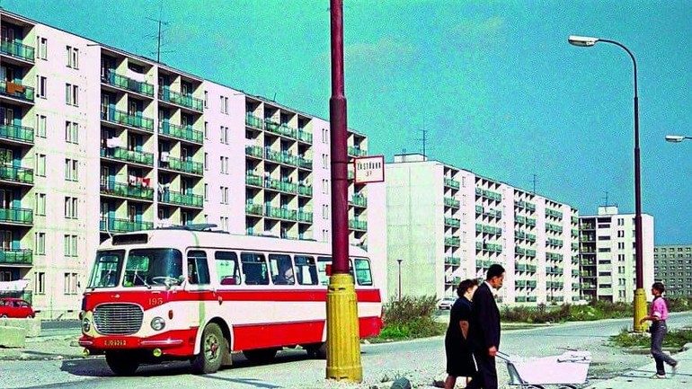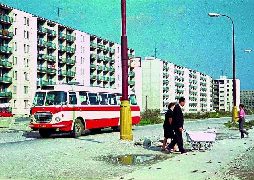 "Na fotke sú Ostredky, konkrétne paneláky na Súmračnej ulici," napísal hudobník Jozef Buntaj k tejto fotke a pokračoval: "Nasťahovali sme sa tam v roku cca 1966, nepamätám si celkom presne, lebo som mal štyri roky. Za paňou, ktorá tlačí kočík, sú dva rady balkónov. Na piatom poschodí, ten vpravo bol náš. Bol to jeden a pol izbový družstevný byt, ktorý mamina kúpila za 19 500 Kčs. Tí kočíkoví manželia sa práve chystajú prejsť cez betónový podklad, ktorý bol prichystaný pre koľajnice pre električky - dnes tam jazdia linky č. 8 a 9 myslím. A v auguste 1968 po tej ceste, kde stojí autobus, v noci prichádzali od letiska tanky a nákladné autá s Rusmi. Spoza okien sme sa na nich dívali."
