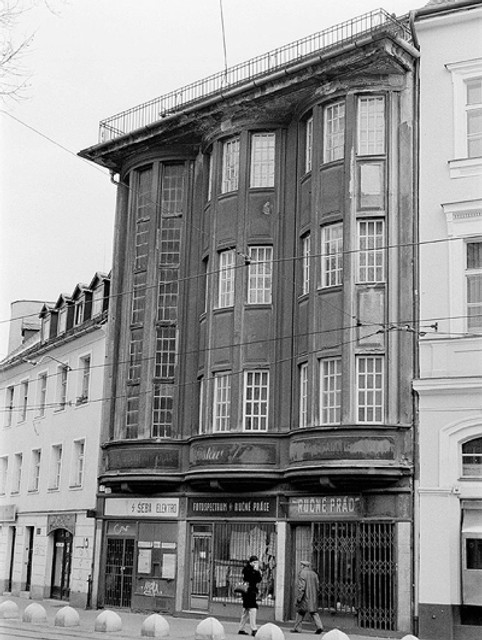 Na rozdiel od vtedy módnych jednoduchých plošných a pokiaľ bolo možné sklom obložených fasád, riešil poschodia nad nenápadným prízemím s obchodnými priestormi veľmi originálne. Navrhol tri vysoké arkiere na pôdoryse segmentov kružnice, ktoré len málo vyčnievajú z úrovne priečelia. Sú podoprené betónovými konzolami a nesú spoločnú mohutnú rímsu. Ľavý arkier nad nenápadným vchodom obsahuje schodisko. Arkiere majú okná členené na malé plôšky, čo celej budove dáva starobylý a tajuplný ráz. Nad tromi podlažiami arkierov je ešte jedno ustúpené podlažie so širokou terasou.