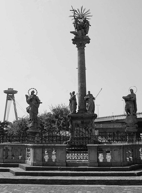 Na konci 18. storočia k stĺpu postavili ešte dve sochy, ktoré predtým zdobili most pred Vydrickou bránou. Sú to Panna Mária Immaculata, a svätý Štefan, prvý uhorský kráľ, ktorý podľa legendy daroval Bohorodičke svoju kráľovskú korunu. Aj kamenný svätý Štefan ju niesol na poduške. Dnes je poduška prázdna: korunu ktosi ukradol.