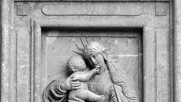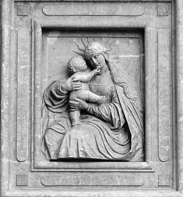 Nad portálom na nádvorí je umiestnený kvalitný reliéf z tmavočerveného mramoru. Predstavuje Pannu Máriu s Ježiškom. Vytesali ho v priebehu 17. storočia podľa staršej predlohy. Reliéf je teda o viac ako sto rokov starší ako palác a možno predpokladať, že sa nachádzal už v staršej kaplnke na tomto mieste. Použitý červený mramor je z ložísk v okolí Ostrihomu, ktorý bol ešte v 17. storočí obsadený Turkami. Mal ostrihomským arcibiskupom, ktorí žili v Prešporku „v exile“, sprostredkovať pocit pobytu v posvätnom mieste uhorského kráľovstva, ktorého meno arcibiskup vo svojom titule používal?