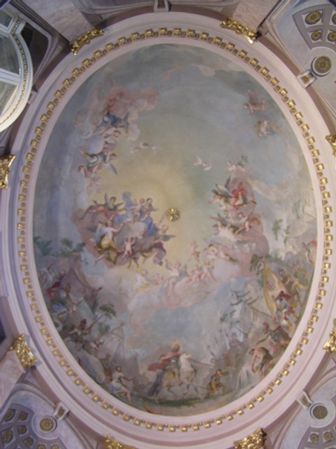 Vo výklenku oproti hlavnému oltáru je nad dverami do sakristie situovaný balkón s organom. V diagonálnych výklenkoch vo výške reprezentačného poschodia sa nachádzajú lóže pre spevákov a súkromné oratórium arcibiskupa prekryté jemnou drevenou zasklenou konštrukciou. Kaplnka predstavuje jednotné umelecké dielo konca 18. storočia zhotovené viedenskými umelcami. Fresková výzdoba kupoly, dielo viedenského majstra F. A. Maulpertscha a jeho žiakov, bola dokončená v máji 1781. Predstavuje zázrak svätého Ladislava, ktorý z nebies sleduje Panna Mária s Ježiškom na rukách.